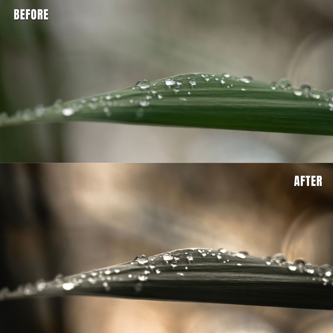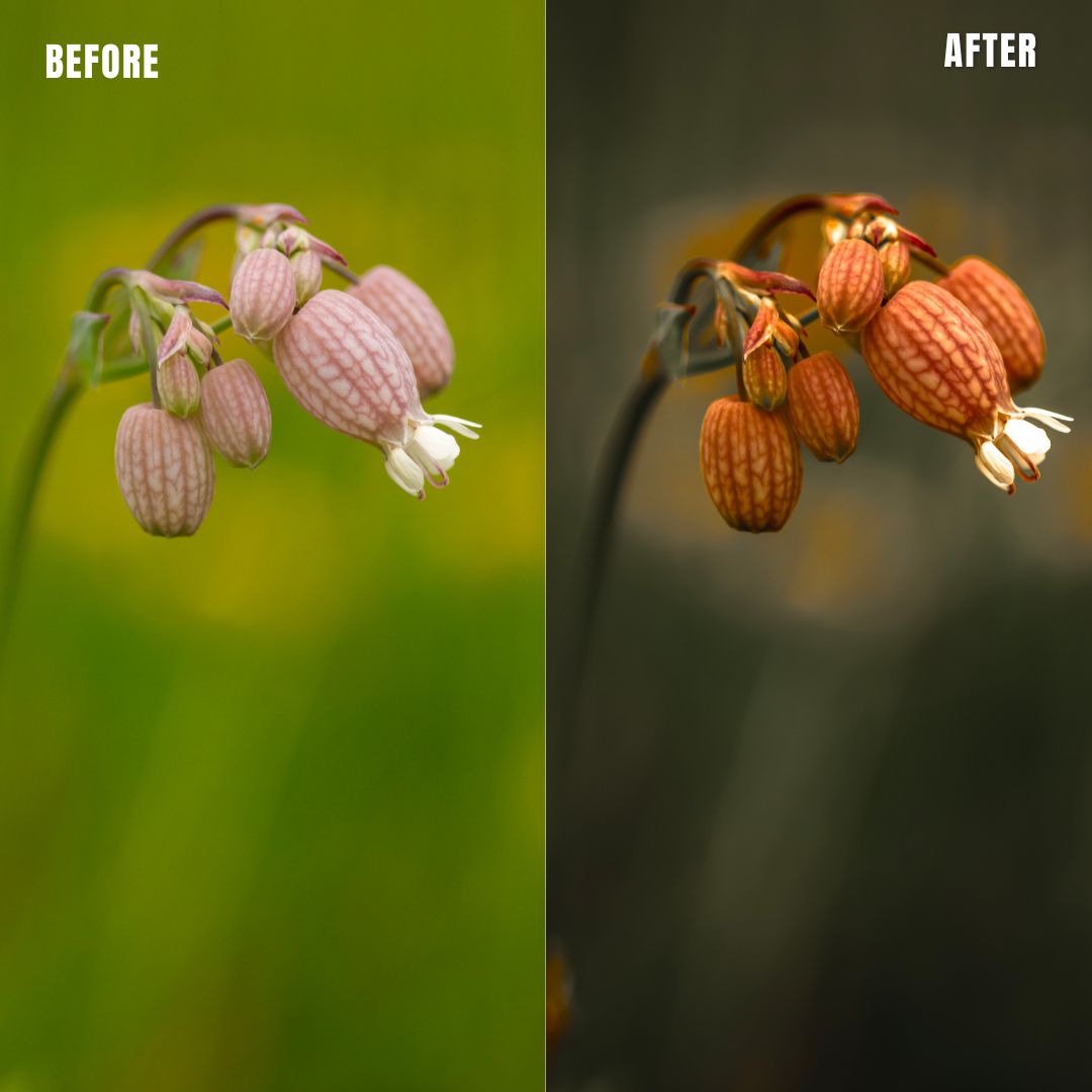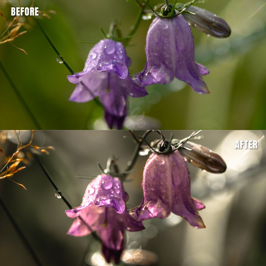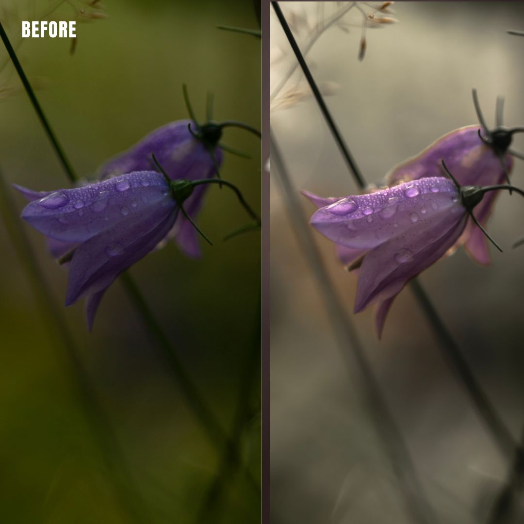 Macro Photo Presets pack of 11 presets for Adobe Lightroom® suite in muted clear greens with warm support tones. Suitable for greeneries to get a muted, moody look. Creates a new and artistic look for all your macro photos.